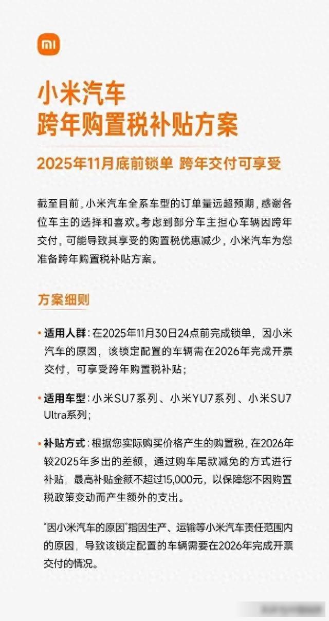 10月24日牛点策略,小米汽车正式推出全系购置税补贴方案:2025年11月30日24点前完成锁单的用户,若因小米生产或运输等原因需延期至2026年交付的,可享受跨年购置税差额补贴。补贴将通过购车尾款直接减免方式,最高补贴金额不超过15000元,覆盖SU7、YU7、SU7 Ultra全系车型。