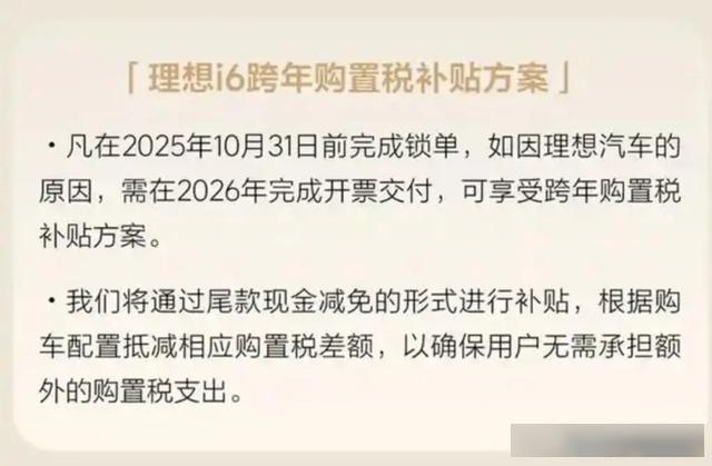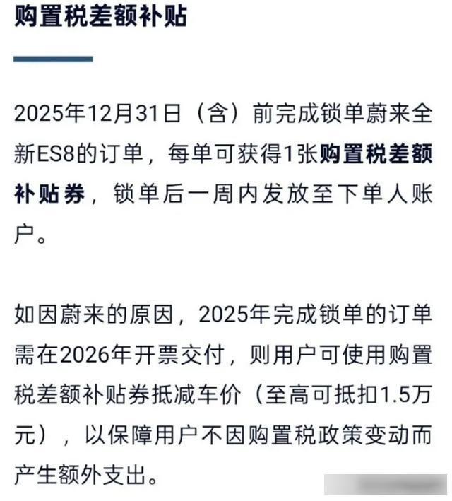 例如牛点策略,蔚来于9月发布“全新ES8安心锁单方案”,承诺在2025年年底前完成锁单的用户,如因车企原因需在2026年开票交付,可享受至高1.5万元的购置税差额补贴。