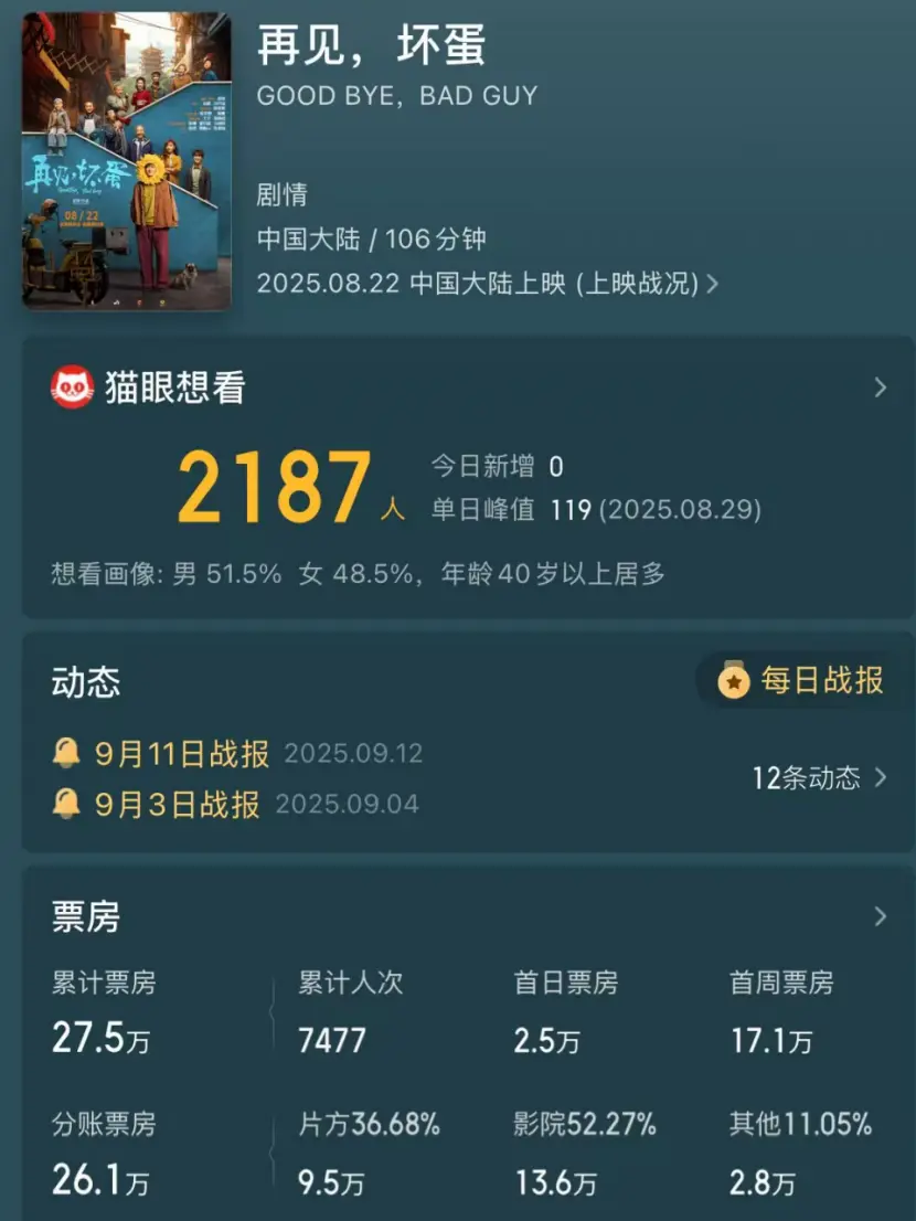 去年打着“吴京出品”旗号的《再见,坏蛋》, 更是遭遇了前所未有的惨败,6天内累计票房20多万,单日票房连过万都做不到,片方只好急匆匆撤档。