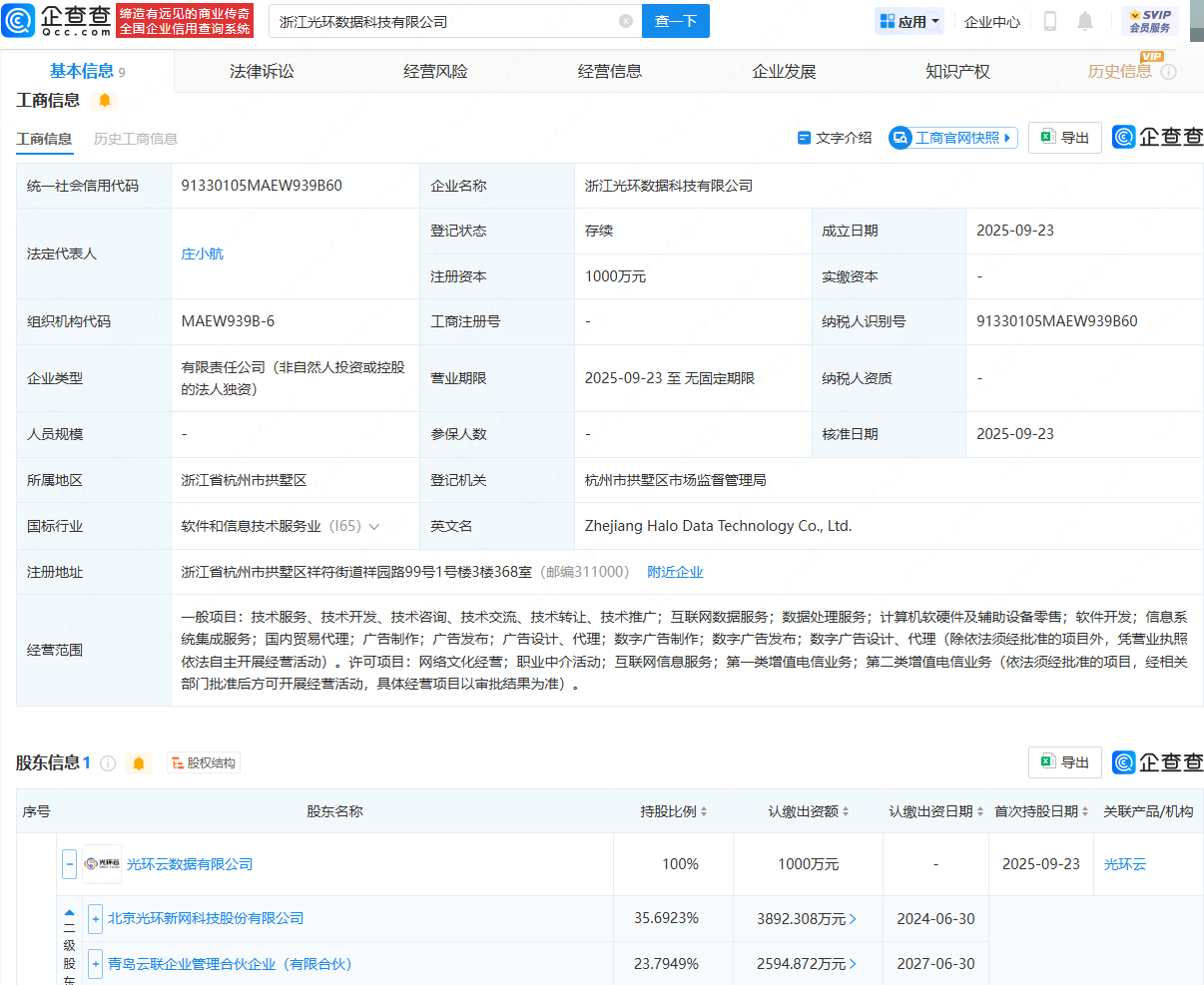 近日,浙江光环数据科技有限公司成立创盈中心,法定代表人为庄小航,注册资本为1000万元,经营范围包含:互联网数据服务;数据处理服务;计算机软硬件及辅助设备零售;软件开发;信息系统集成服务等。企查查股权穿透显示,该公司由光环云数据有限公司全资持股,后者由光环新网(300383)等共同持股。
